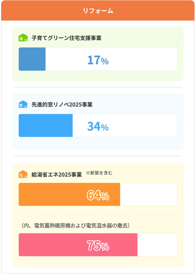 進捗34%とはいえ、秋にペースが加速する傾向もあるため、特に窓・断熱関連リフォームは早めのスタートがカギ。今年度が最後の大型補助金となります。