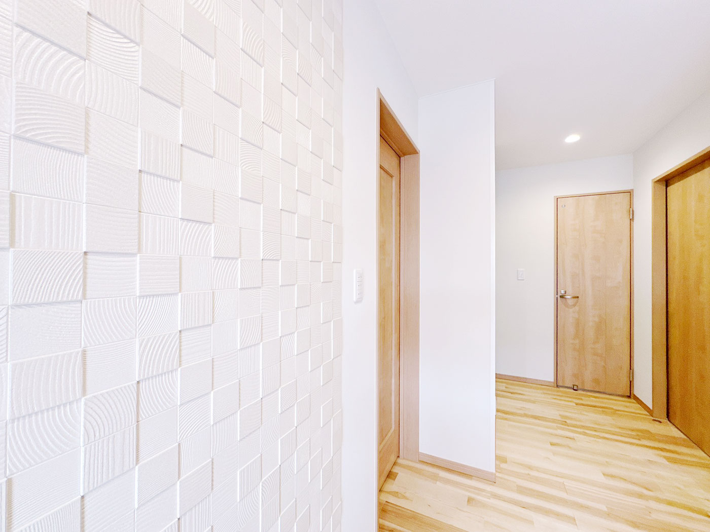床材は無垢材、壁は珪藻土クロスとエコカラットを使用し、健康に配慮した空気のおいしい、住む人にやさしいお家