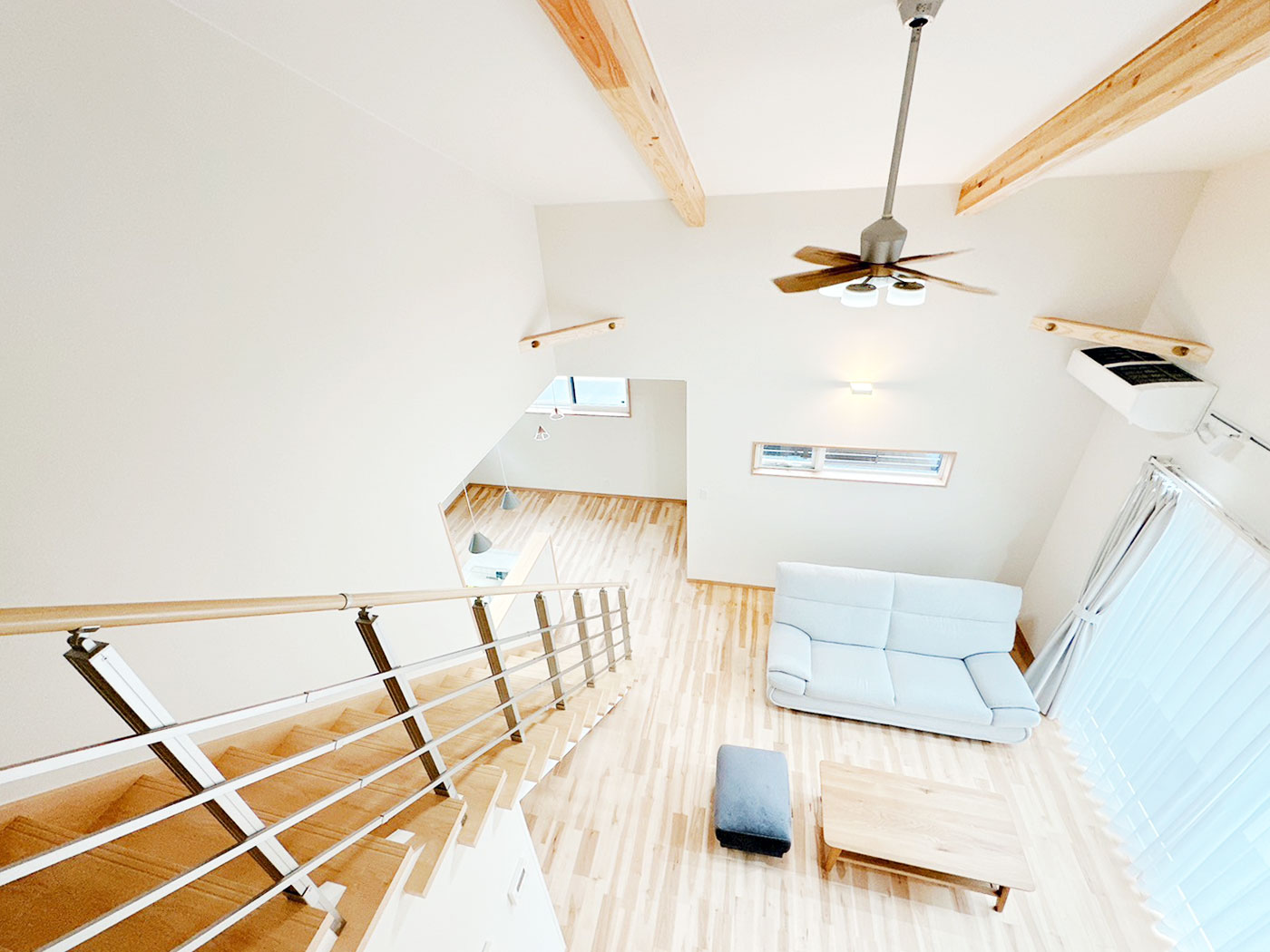 天井の高い明るいリビング。ささら桁の白がアクセントのデザイン階段は明るさが広がり、オープン手摺が安全を演出。