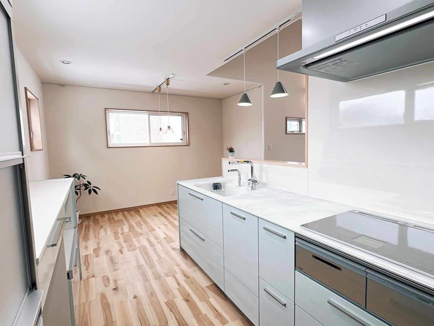 機能性とデザイン性を兼ね備えた人気のキッチン・ダイニング横並びレイアウト。システムキッチンは、カップボード含めTOTO「ザ・クラッソ」