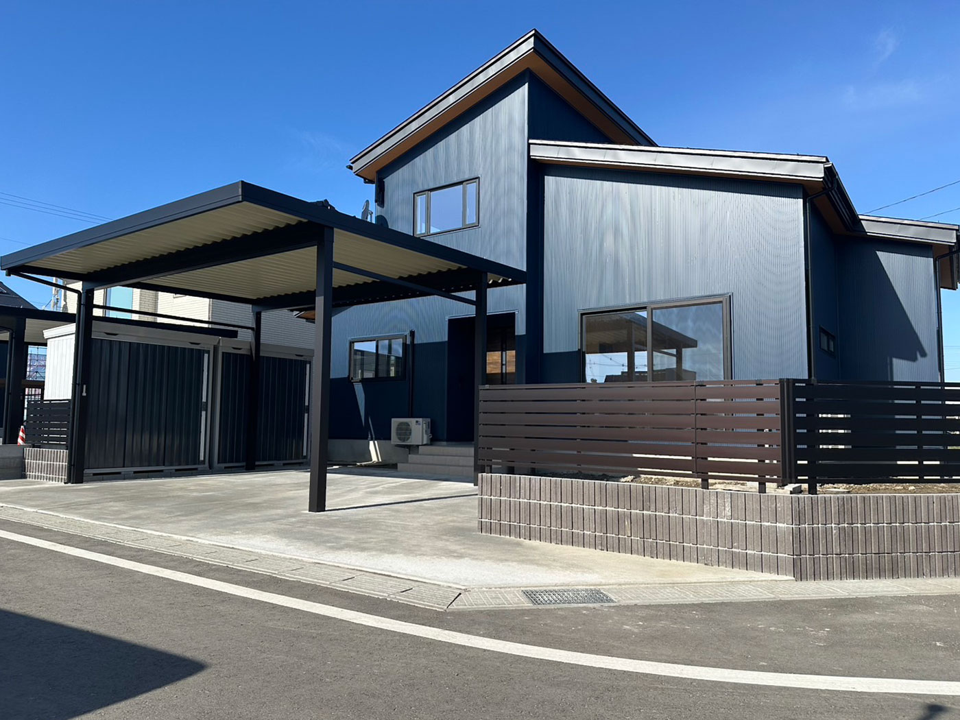 特注した7.0m長さのアイジー金属サイディングのスリムラインで、正面外壁に中間見切り材を使用しない、すっきりとした外観に