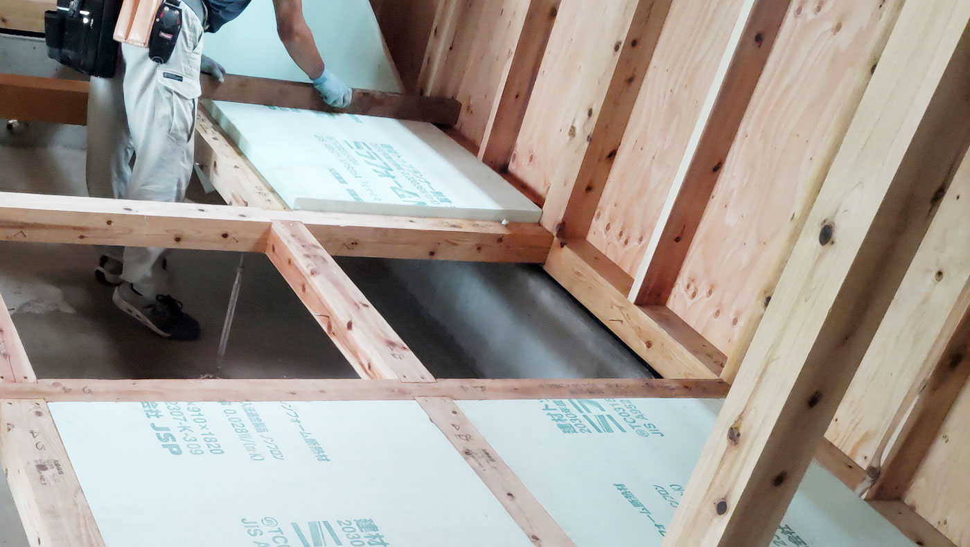 床下にはIS A9521に規定される押出法ポリスチレンフォーム断熱材を使用。熱伝導率はコンクリートの約1/50。